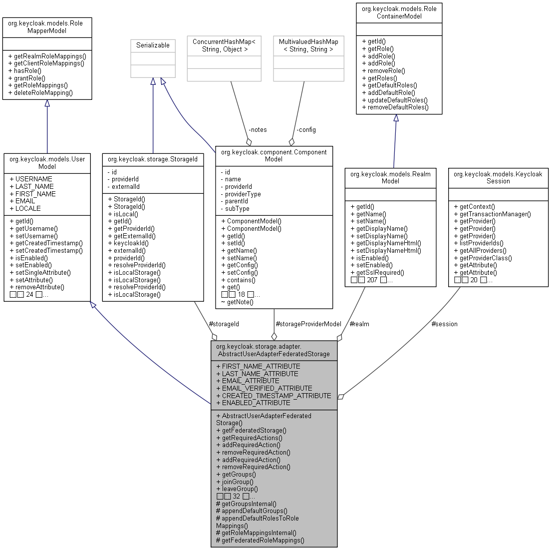 Assumes everything is managed by federated storage except for username. getId() returns a default value of "f:" + providerId + ":" + getUsername(). UserModel properties like enabled, firstName, lastName, email, etc. are all stored as attributes in federated storage.